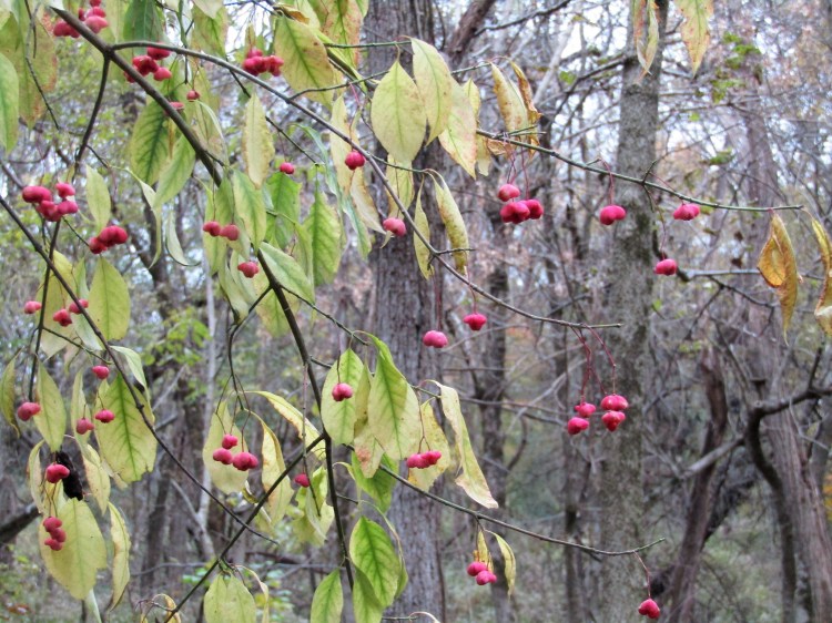Early fall brings another red berry besides Spicebush, the somewhat uncommon Wahoo, or Eastern burning bush (Euonymus atropupureus). As one of the common names suggests, it’s closely related to the non-native, invasive Burning bush (Euonymus alatus) so often planted for its red fall foliage. Wahoo would likely be more common in this forest, but for the fact that deer browse it heavily (most Euonymus are highly deer preferred).