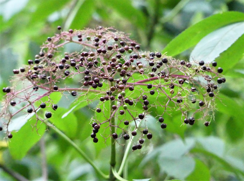 Black elderberry fruits are the next to ripen, following pollination of the broad flat-topped corymbs of tiny white flowers. Like other berry producers, this plant provides twice – nectar and pollen for insects, and fruits for birds, mammals and box turtles.
