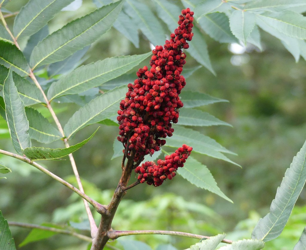 Sumac berries are among the last fruits of the year. The dense clusters at the end of branches will persist through the winter, providing food for birds when little else is available. For this reason, and the valuable cover they provide, the forest stewards have been planting Shining sumac, since sumac patches no longer existed at the forest edges. The fruit in the pic above is part of the first crop produced by a patch we planted two years ago. Now well established, the original plants are taller than me, and the patch will spread clonally over time. When restoration plantings succeed this well, I feel hugely rewarded for all the hard work!