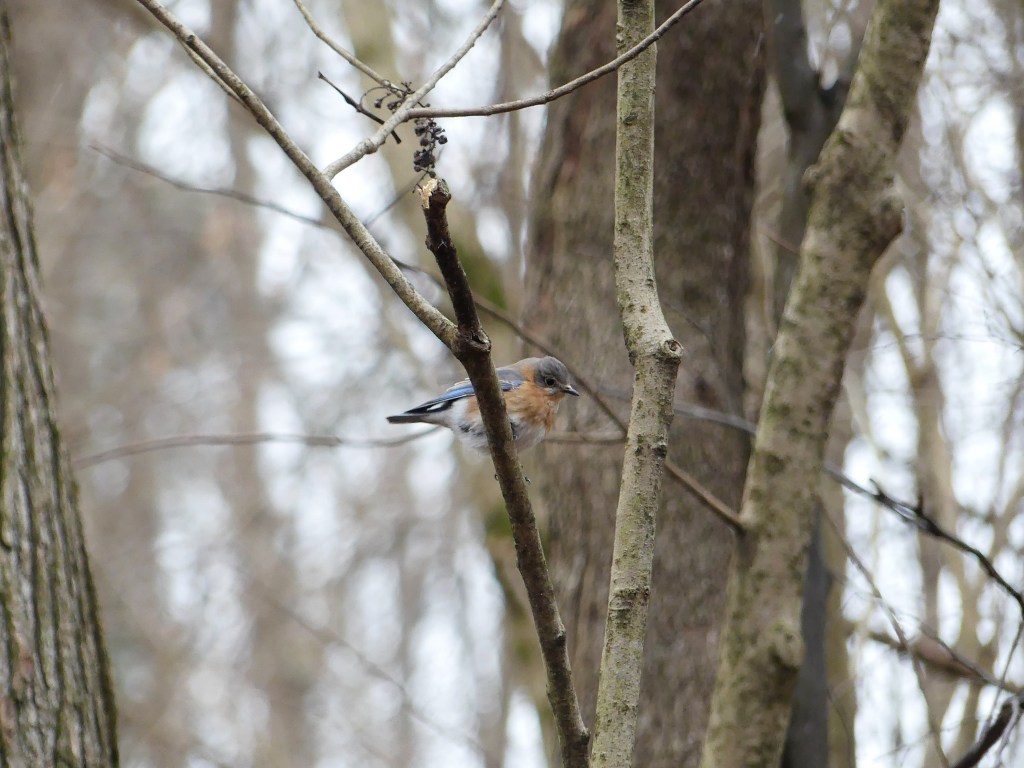 On a recent cold, drab day with fine snow drifting down, I looked up from my invasive plant puttering and glimpsed a flash of blue. There they were, the first band of the winter, moving quietly through the forest. Though birds of open country in nesting season, bluebirds seem to like woodlands for winter foraging. Like Robins, bluebirds are true thrushes, and their feeding behavior reflects this.