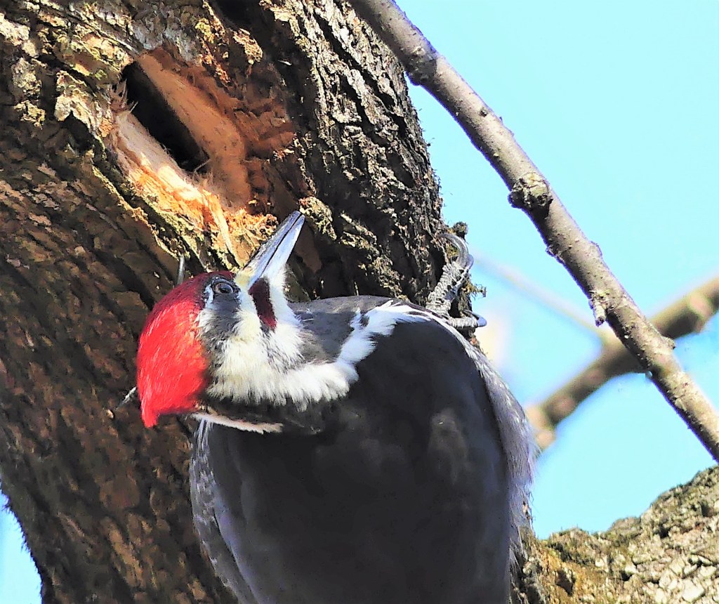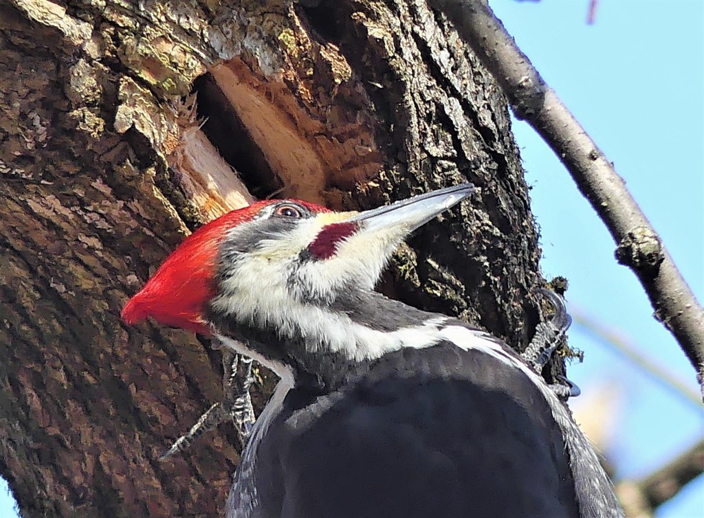 Last week I watched this male bird with its impressive chisel bill digging for ants in a living tree. He was easy to find, the sound of his vigorous attack carried a long way. Already the cavity was taking on the oblong shape typical of Pileated excavations. The pace was fast, chips were flying, and the only time I could get a non blurry pic was when he raised his head to scan the surroundings. No matter how intent on digging, he paused briefly every thirty seconds or so, likely making sure a hawk was not lurking nearby.