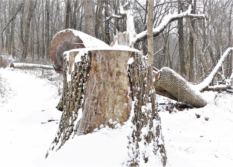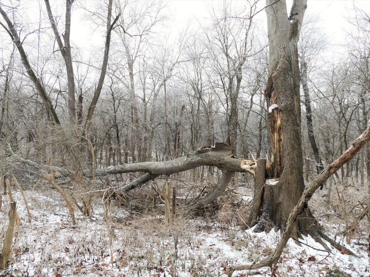 Winter weather is a an important shaper of life even in the relatively mild climate of the Eastern deciduous forest. The huge hackberry above, one of the tallest trees in the forest, lost one of its trunks due to the weight of ice on the widely branching canopy. The tangled mass of limbs now straddles a small spring-fed pond, and will be a favorite bird hangout for years to come.