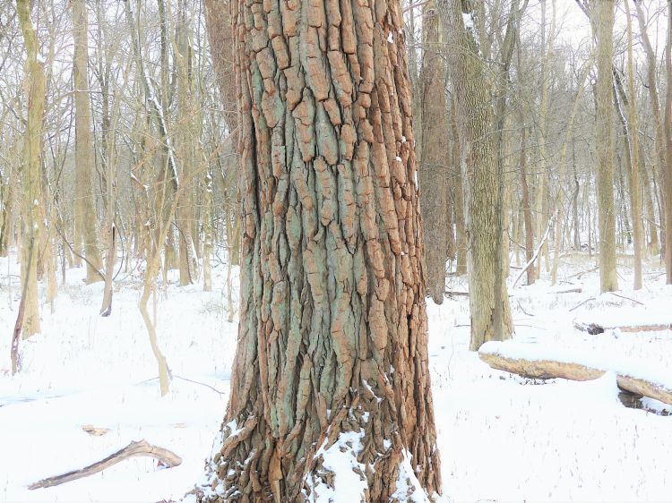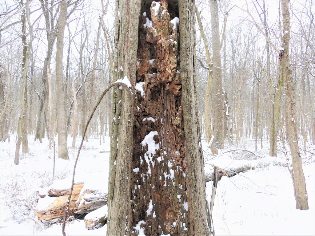 Half of this old American elm is exposed heartwood, first tunneled by insects then mined by woodpeckers.